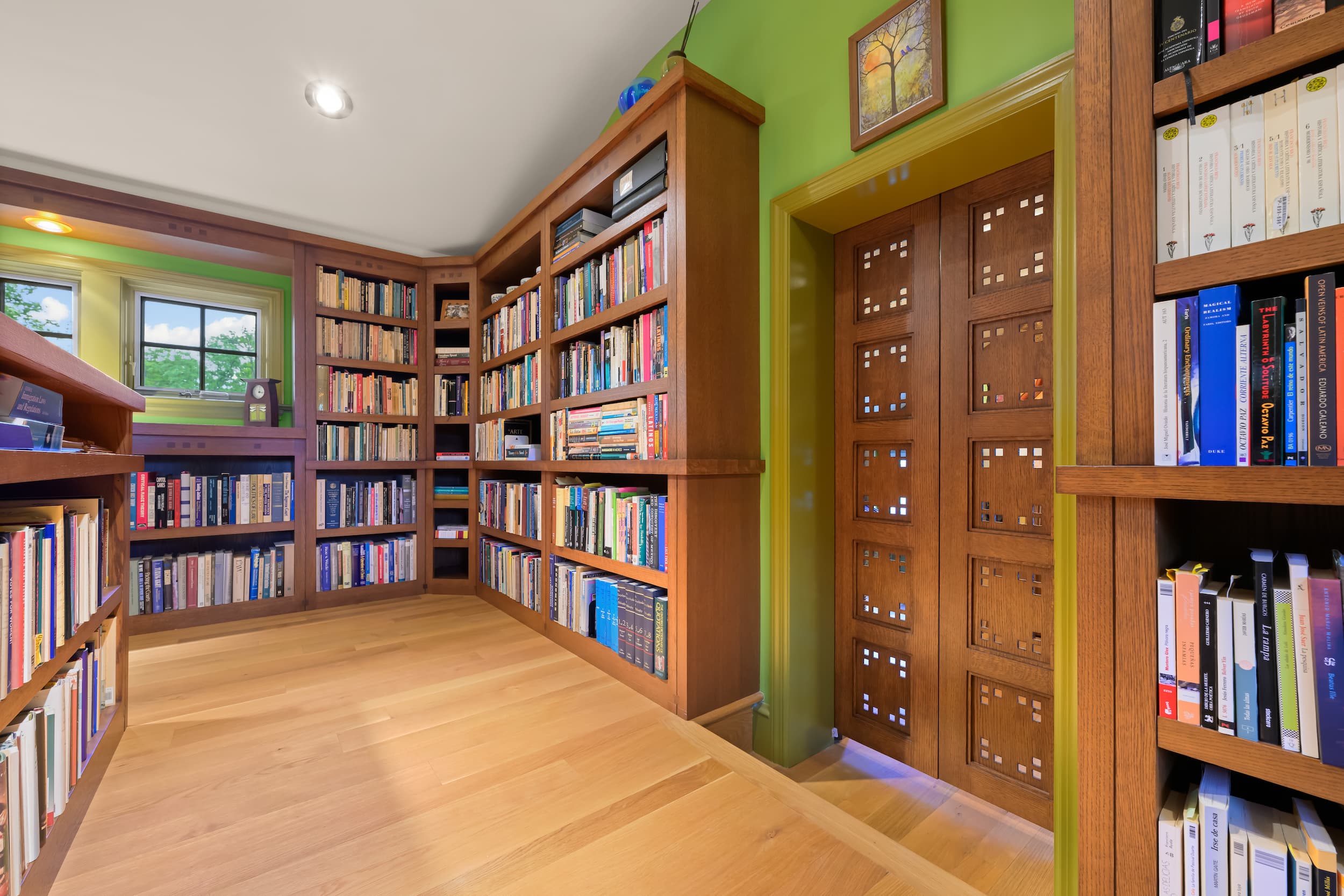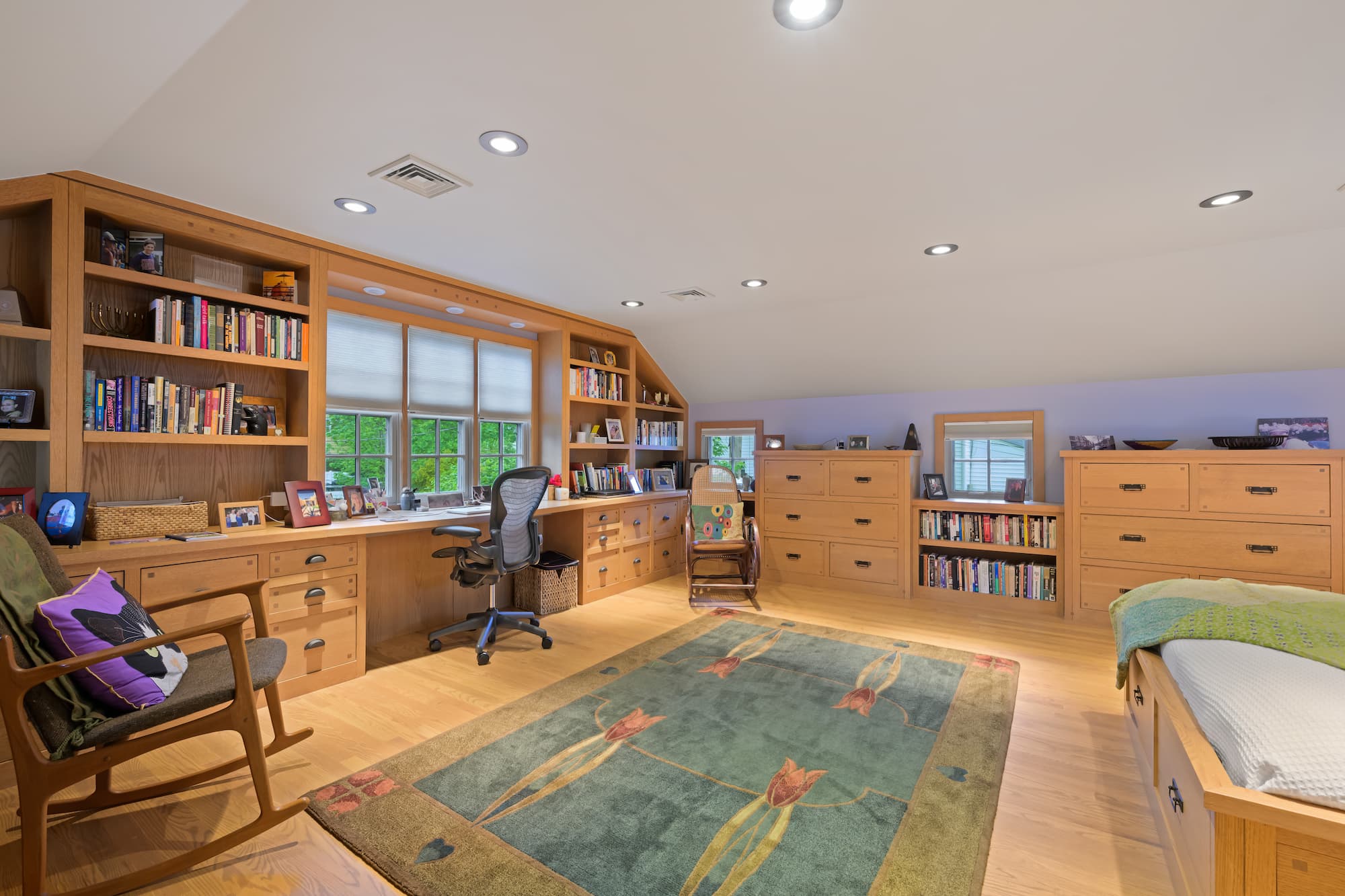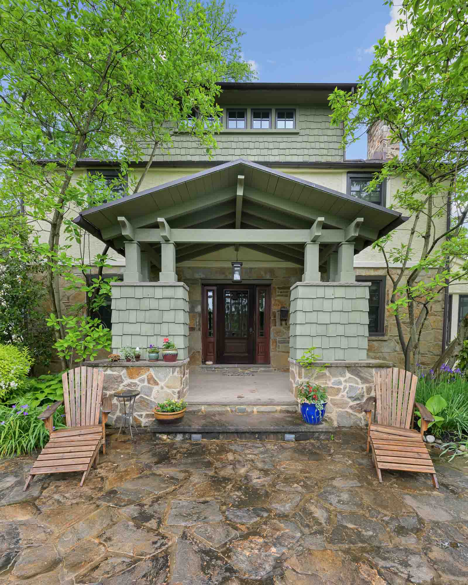 From the outside, the front porch proudly welcomes you with its true dimensional cedar structure, copper roof, step lights, rain chains, and stonework. Looking up, the third-floor attic was expanded by lifting the middle roof and adding two large dormers. This space is now a quiet escape, complete with another custom library, office, daybed, and cedar closet.