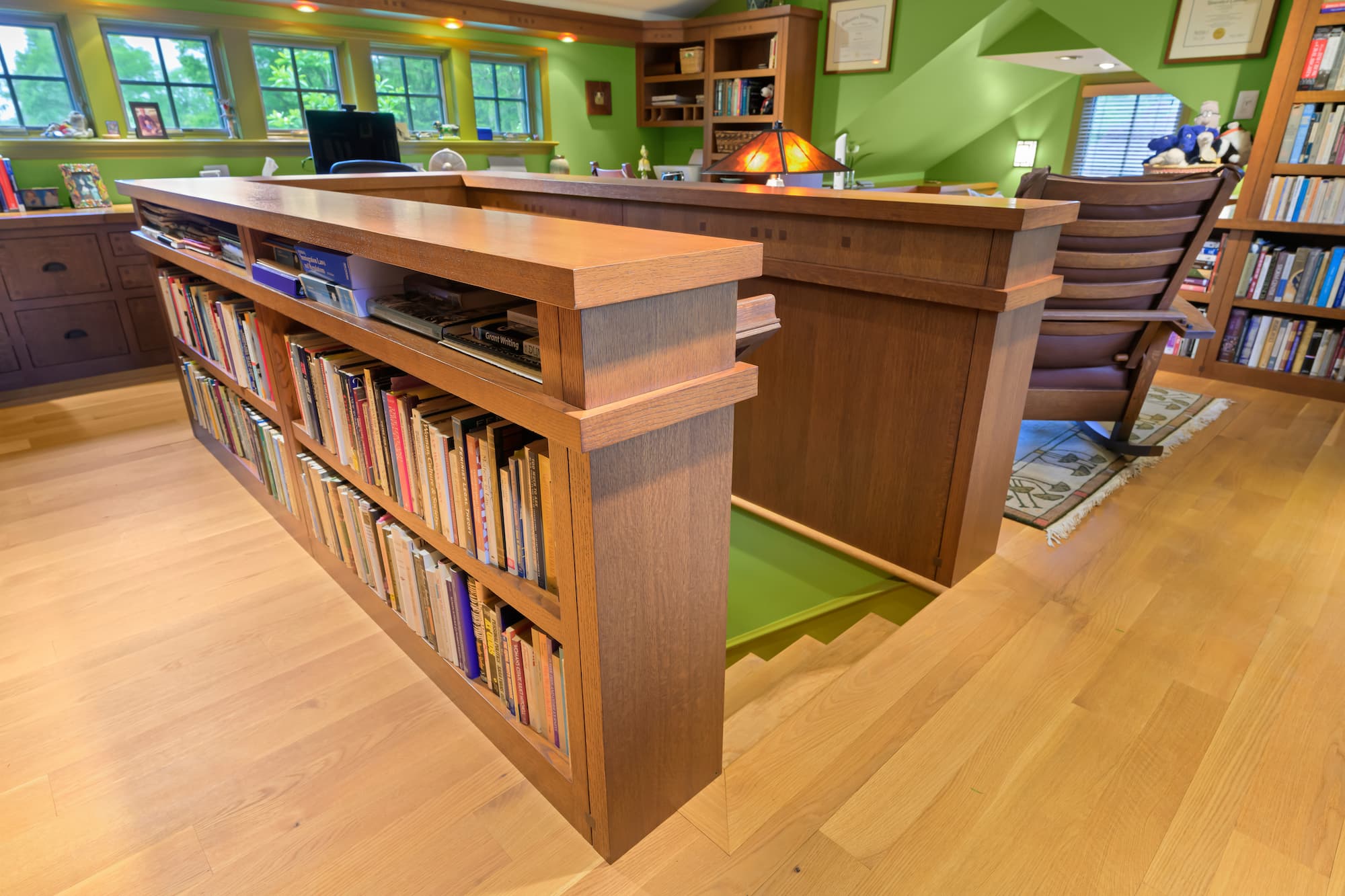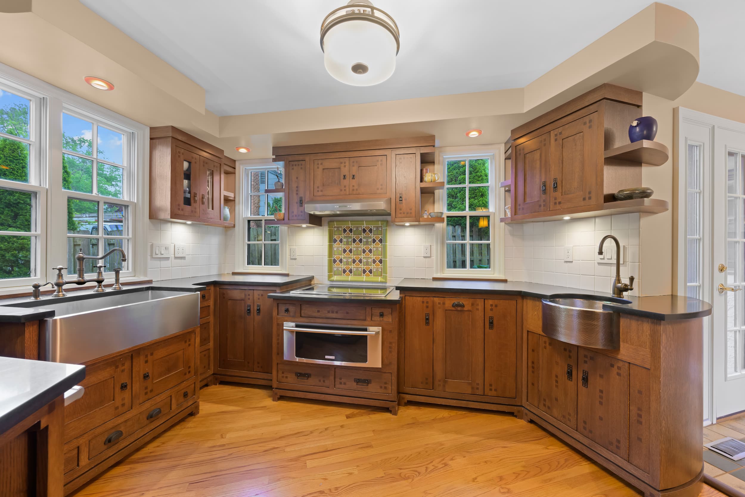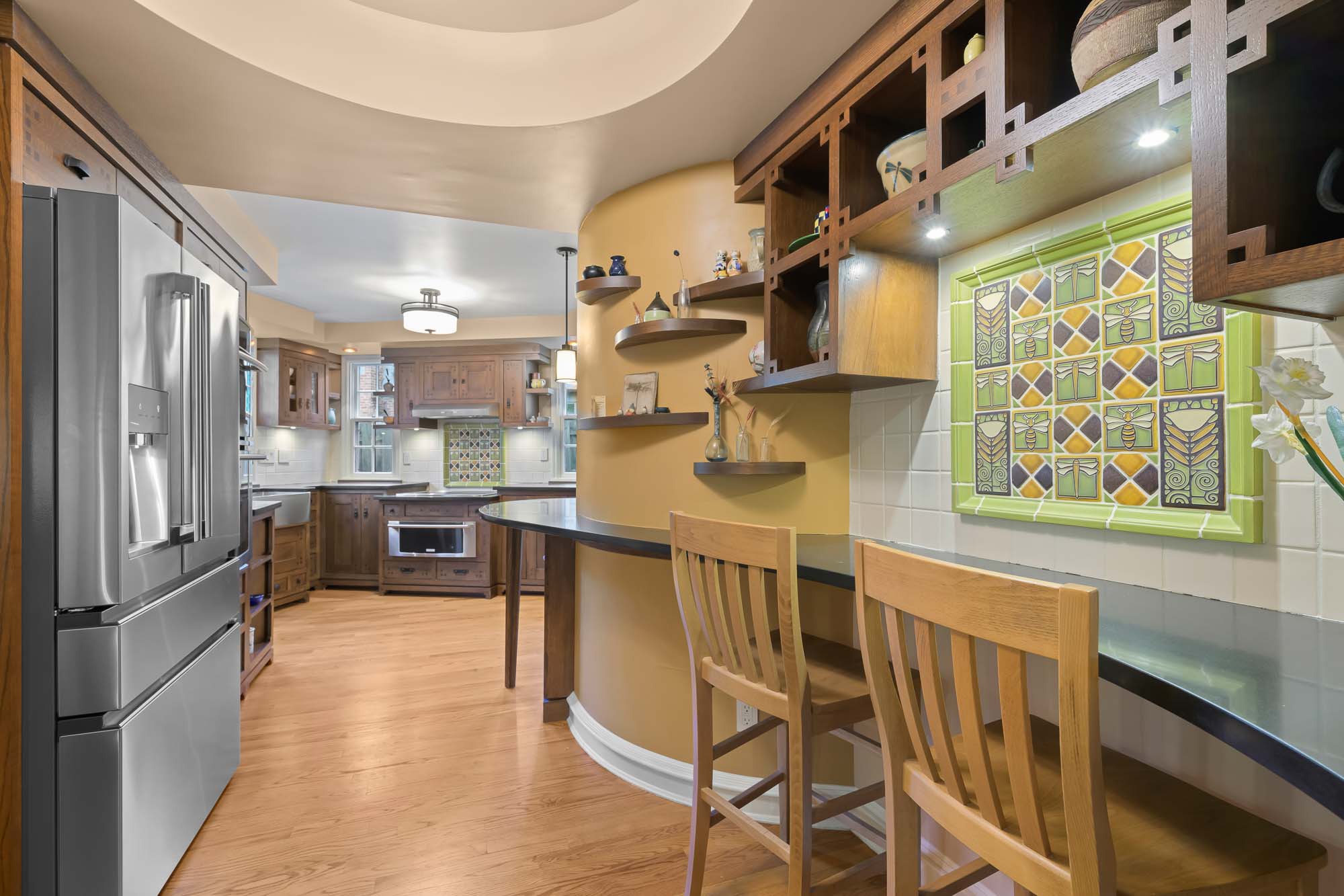 In time, the owner—an author and professor emeritus—recognized the need for housing her expansive book collection, as well as a quiet creative retreat and covered front porch. As a native of Santa Barbara, California, the client has long admired its Craftsman architecture. With this inspiration, the details of the work demonstrate a true craftsmanship of materials. Red oak with varying stain finishes, inlays, and hardware used in the custom built-ins reflect that era of building. The kitchen flaunts a honed black granite café countertop, handmade Motawi tile backsplash, floating shelves, a highboard with velvet-lined drawers, and a lowered cooking station for ease of use.