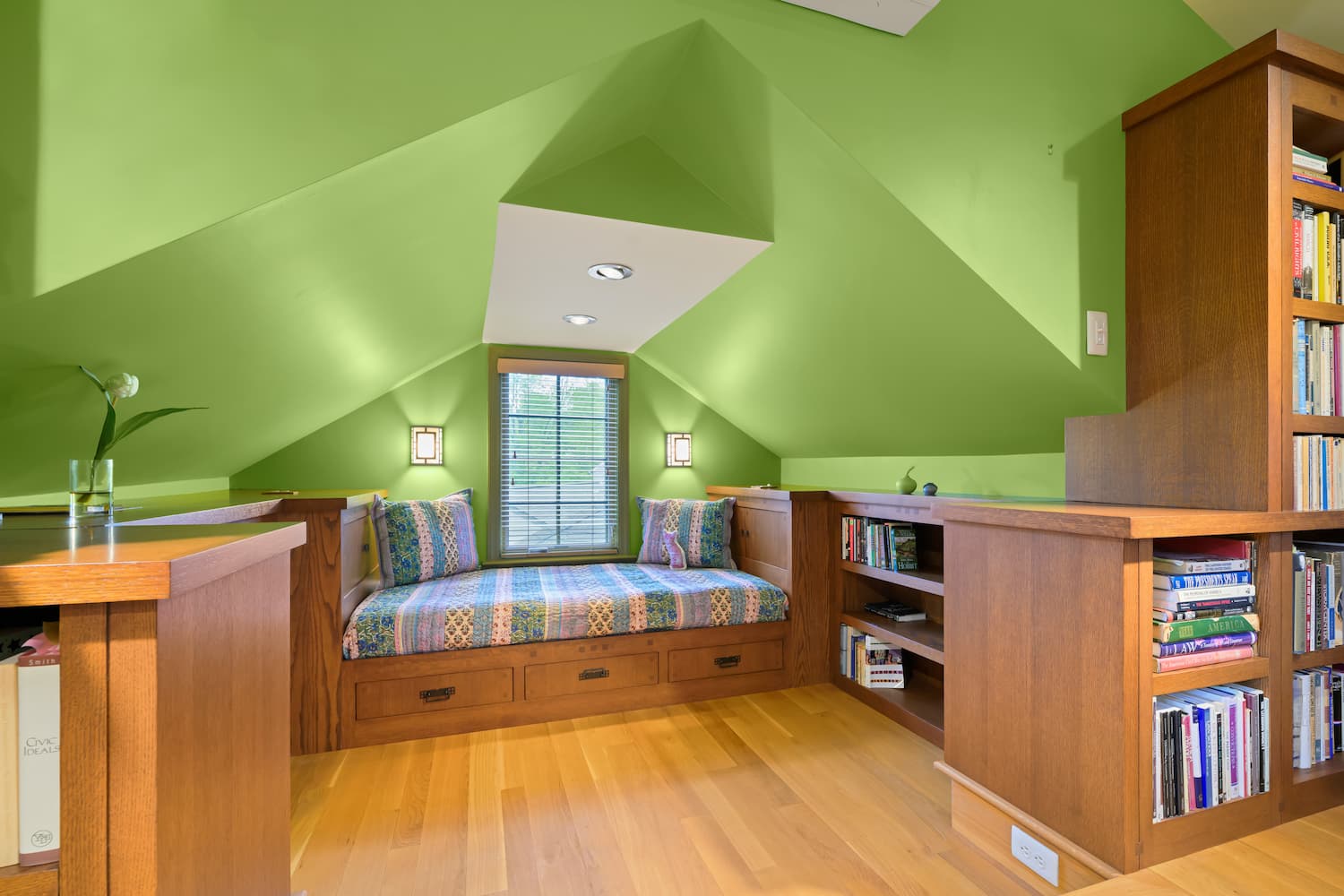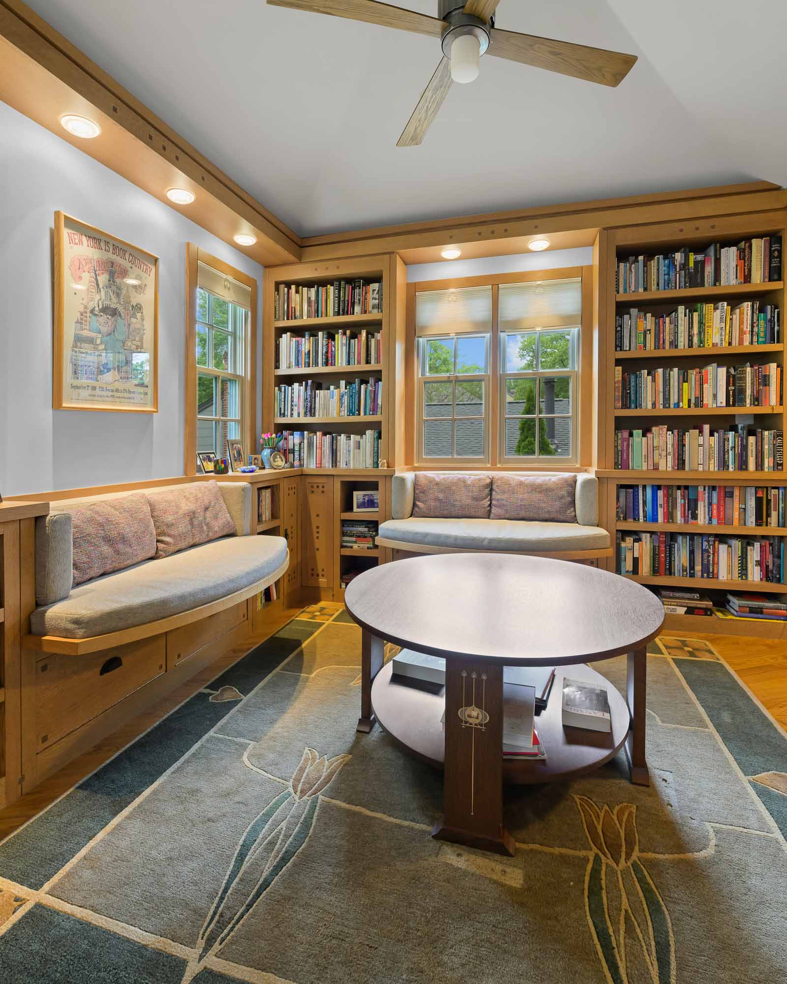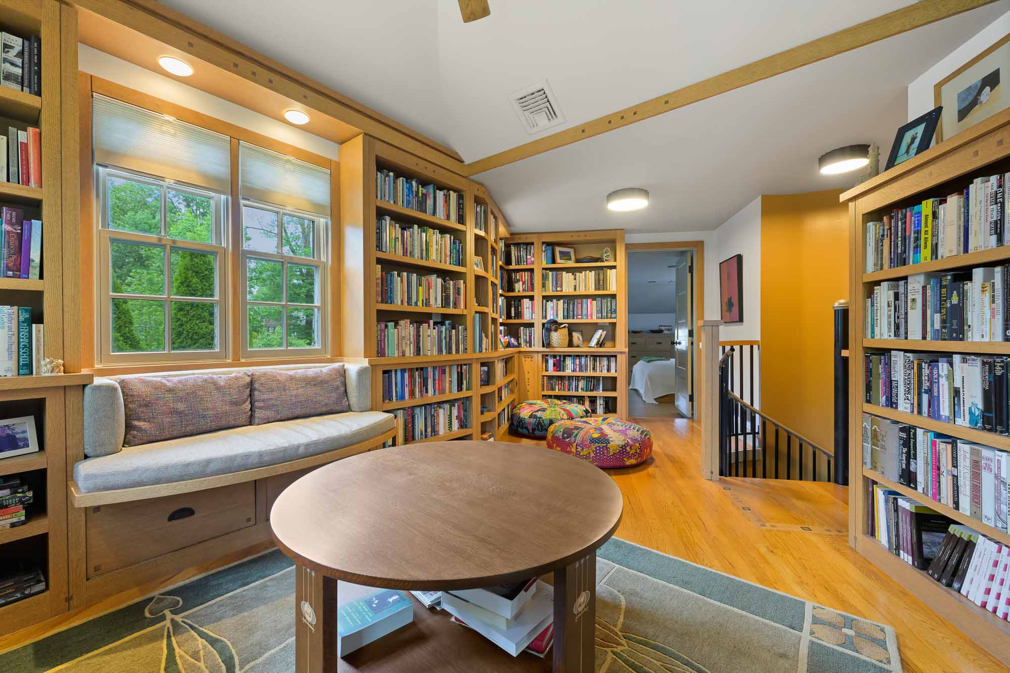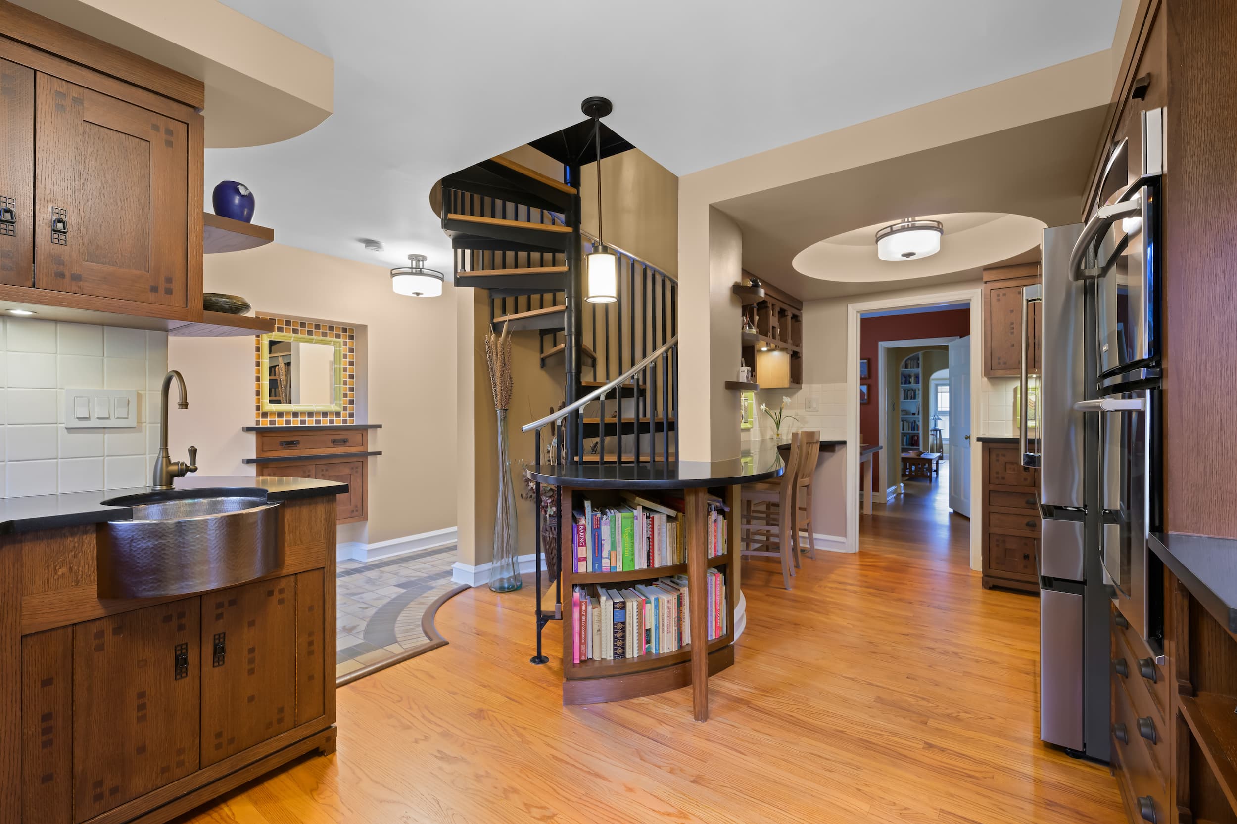 In time, the owner—an author and professor emeritus—recognized the need for housing her expansive book collection, as well as a quiet creative retreat and covered front porch. As a native of Santa Barbara, California, the client has long admired its Craftsman architecture. With this inspiration, the details of the work demonstrate a true craftsmanship of materials. Red oak with varying stain finishes, inlays, and hardware used in the custom built-ins reflect that era of building. The kitchen flaunts a honed black granite café countertop, handmade Motawi tile backsplash, floating shelves, a highboard with velvet-lined drawers, and a lowered cooking station for ease of use.