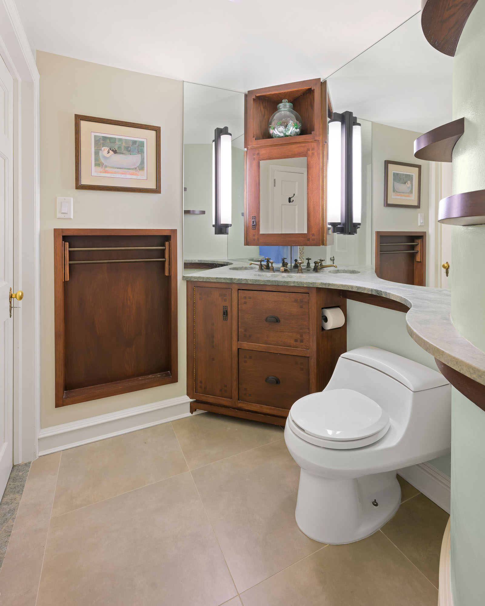 Throughout the house, consistent detailing fuses Craftsman style with curvilinear features. Conveying a sense of nostalgic sophistication, the architecture is complex yet intuitive, evoking warmth, comfort, and ease